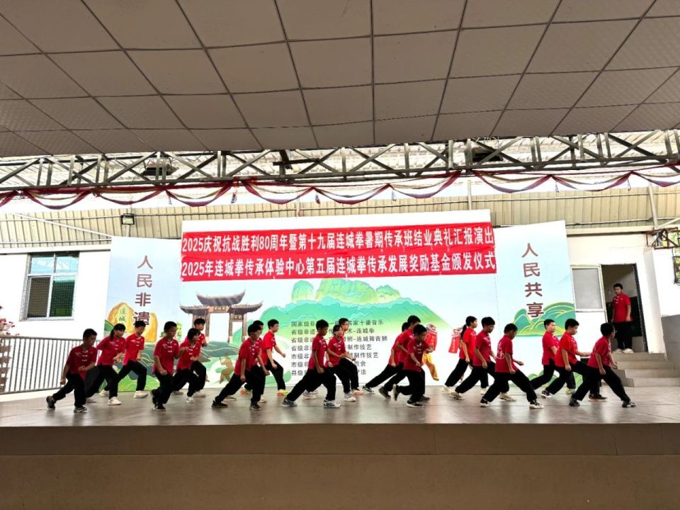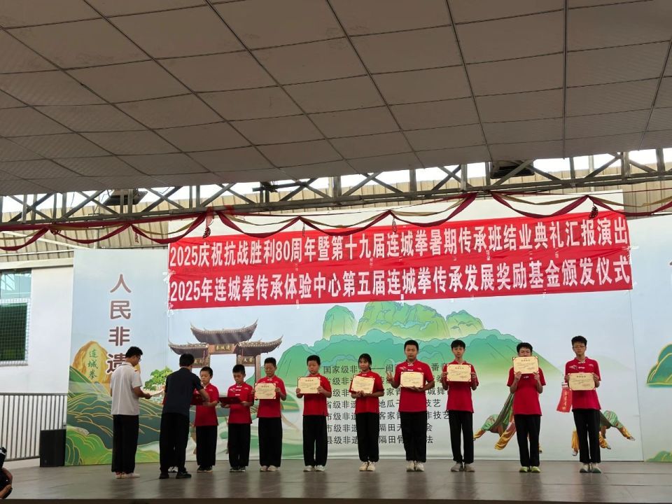 近日,连城县连城拳传习中心举行2025第十九届连城拳暑假传承班结业典礼暨第五届连城拳传承发展奖励基金颁发仪式,共有18名连城拳弟子获得奖励,这些优秀学子在练习连城拳的过程中,锻炼了健康的体魄,磨炼了顽强的意志,培养了坚韧不拔的品格。